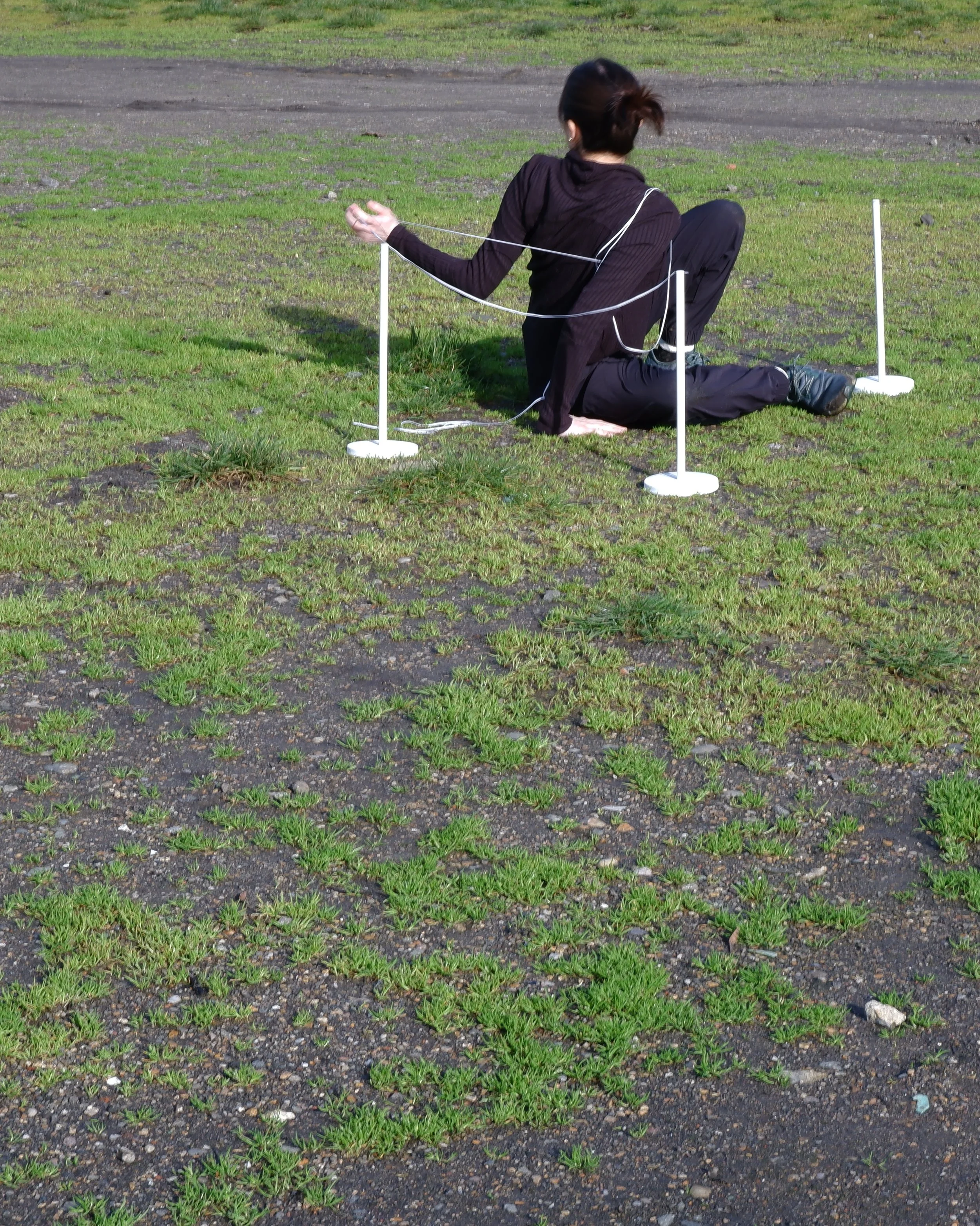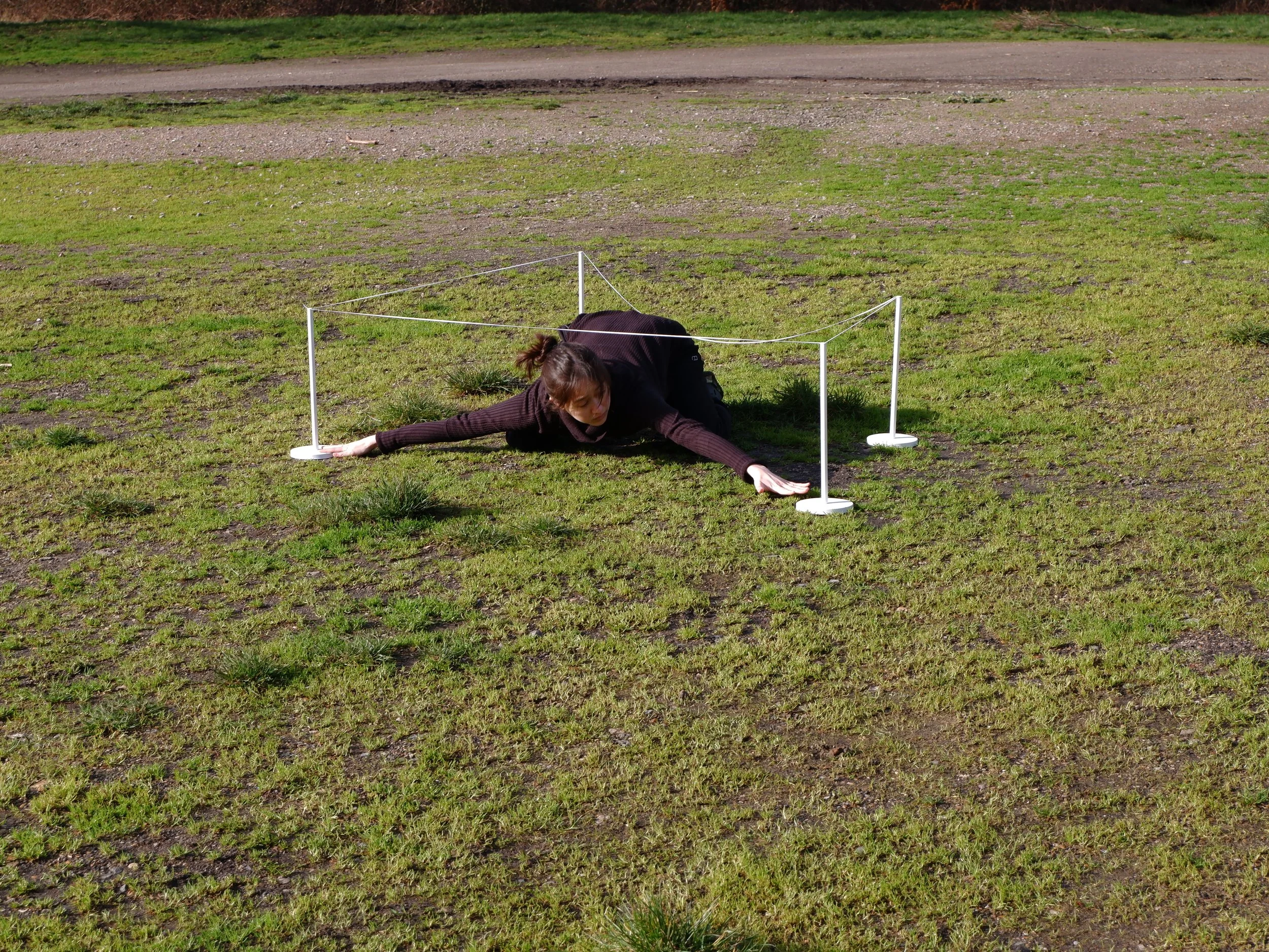 An adaptation of the work, Marking Territory: my bed, ‘97. Restaged as a public performance, the work references land plotting and staking, with gallery stanchions subtly echoing the park’s football stanchions. The performance explores barriers and access, postcolonial narratives of migration, and attempts to claim space shaped by displacement.